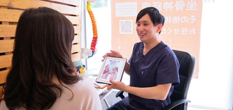 あなたの症状の原因やお身体の状態について、専用アプリを使って分かりやすく説明します。不安な事があれば何でもご相談下さい。
