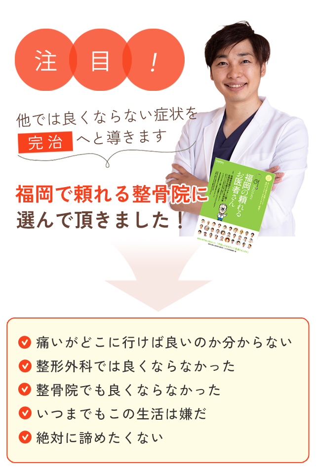 軽度の腰痛でさえ、改善できる院は2割以下だと感じています。8割の院では改善できずに終わるということです。当院にはたくさんの方が来られている理由がここにあると思っています。正しく鑑別診断し、根本原因を改善できるからこそ多くの方にご利用いただいております。通常の整骨院さんではマッサージが主で、整形外科さんでは痛み止めの注射、クスリが一般的となっているのが現状です。